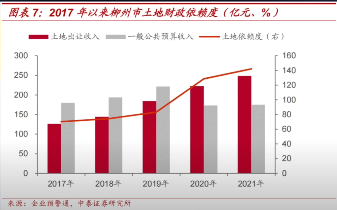 - 2017年柳州土地财政依赖度是70%,2021年是142%
