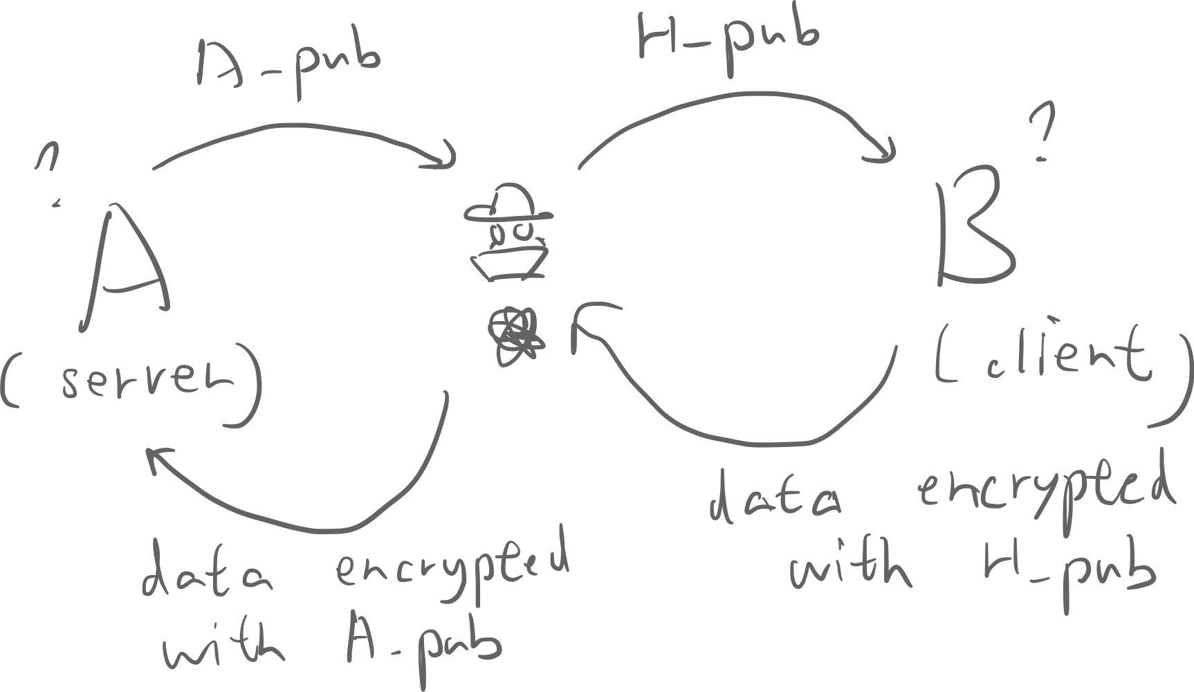 - B以为这个公钥是A的,于是用公钥H加密信息并传回给A